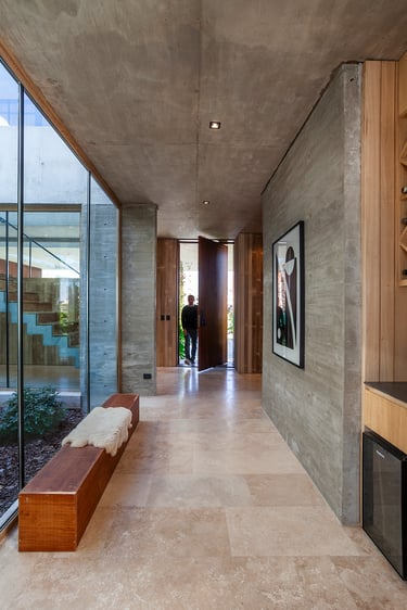 Con un frente ciego que da intimidad pero a su vez invita a pasar esta casa tiene un impacto fresco y luminoso donde podemos ver los elementos estrella del edificio, en el hall de entrada podemos observar “Sin Título” de Ignacio Rivas en 90x126 frente al patio interno en el que desembocan todos los usos.