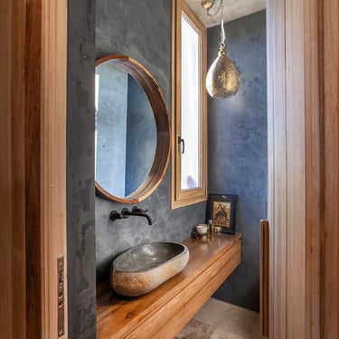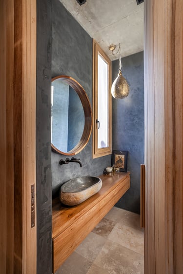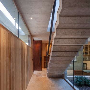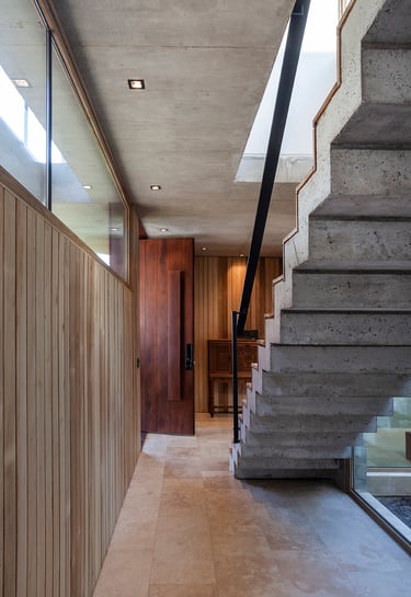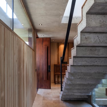 Destacamos también la escalera principal de concreto y escalones de madera, una síntesis de los contrastes de la casa.