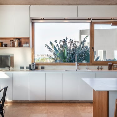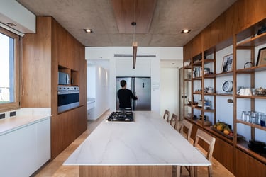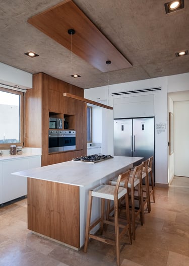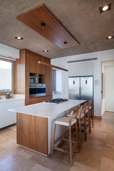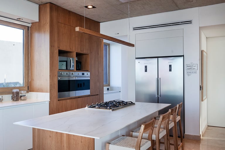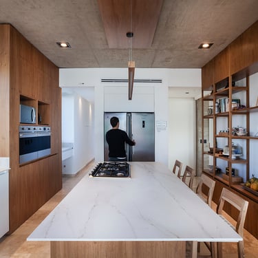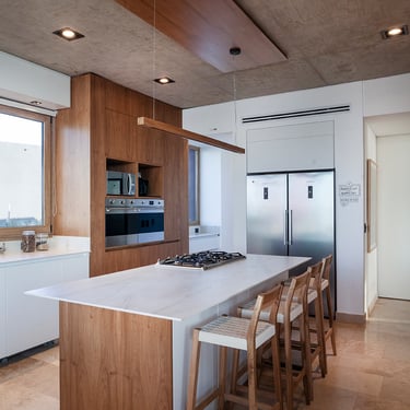 Continuando con el recorrido tenemos la cocina donde el mármol se suma a la composición artística de Arfuso creando un espacio limpio y funcional para las tareas llevadas a cabo en el día a día, madera y tonos de blanco roto se hacen protagonistas junto con detalles en acero tales como el horno y la heladera dan una sensación de profesionalidad.