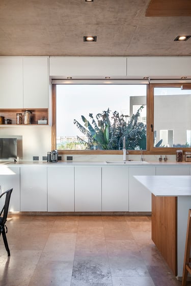 Continuando con el recorrido tenemos la cocina donde el mármol se suma a la composición artística de Arfuso creando un espacio limpio y funcional para las tareas llevadas a cabo en el día a día, madera y tonos de blanco roto se hacen protagonistas y detalles en acero tales como el horno y la heladera dan una sensación de profesionalidad.